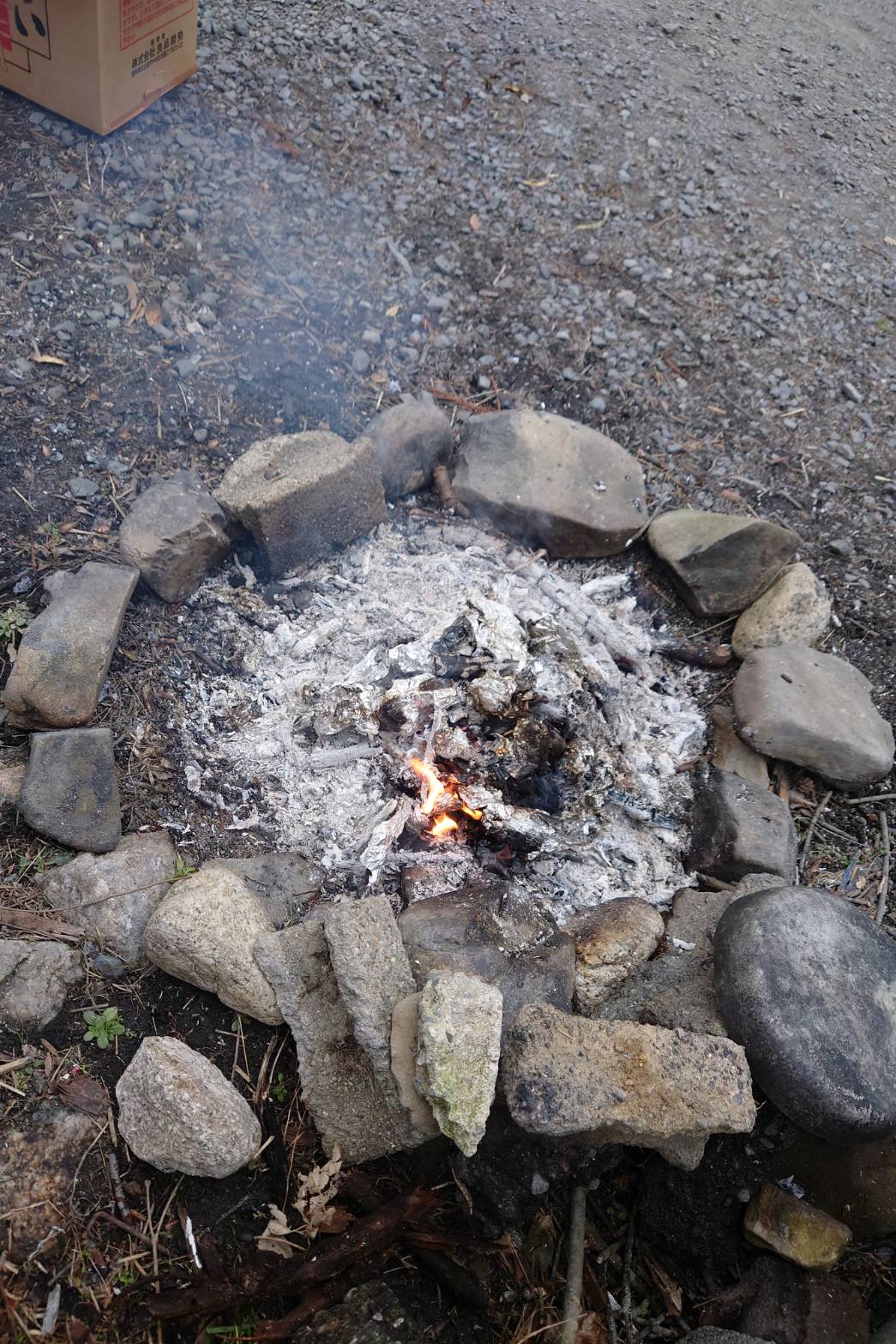 石でまわりを囲み、アルミホイルでお芋を包み、On the 炭火~🔥 ヾ(o´∀`o)ノ